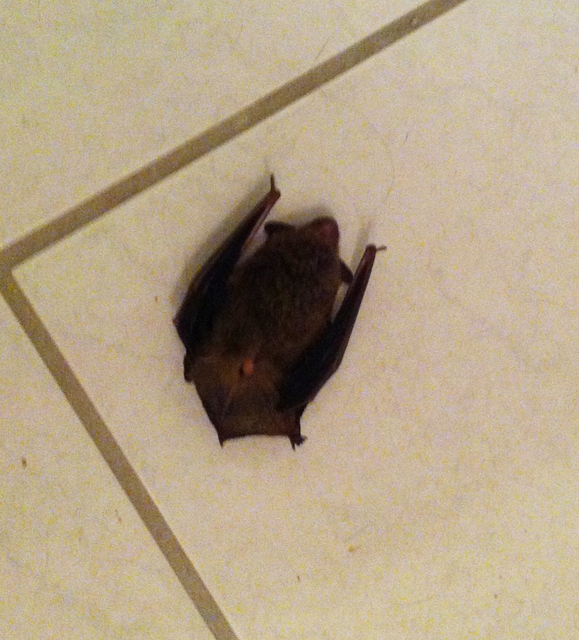 “Good idea. But I’m going to knock him out first.” He starts swinging the broom and hits the bat hard enough to knock him onto the floor. He was not dead. We wrapped him in a towel and placed him outside. He was squeaking when we picked him up. When we checked this morning, he was gone. So, I’m going to assume that he woke up and went home to rest.