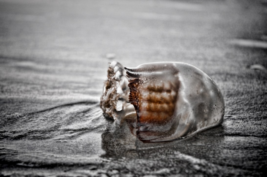 A dead jelly fish waits for it’s carcass to be swept back into the ocean.