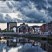 Sunset over the River Liffey in Dublin, Ireland. The calm water reflects the city.