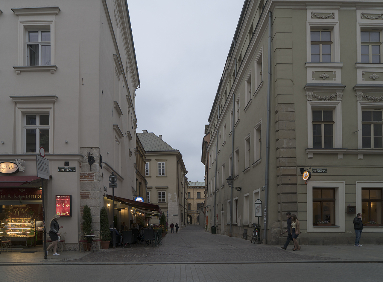 Early evening in Krakow. The street lights are coming on and people are ending the work day.