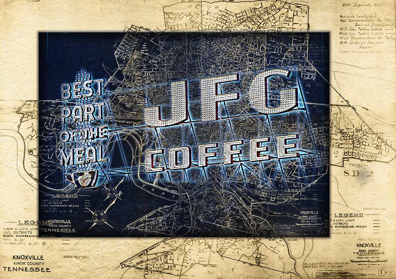 A photo of the JFG lighted sign in the Old City area of Knoxville, TN is collaged with a census map of Knoxville from the 1940s.