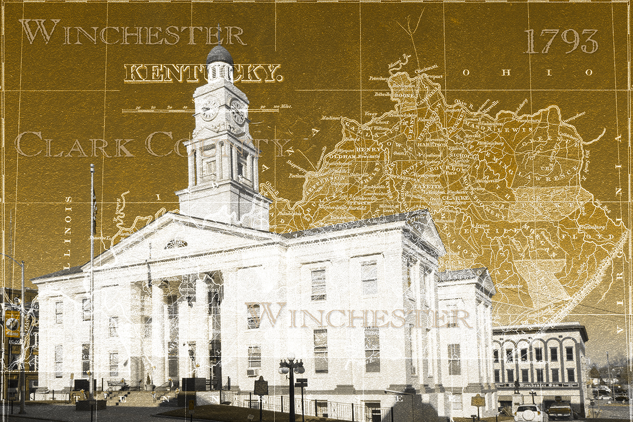 The Clark County Courthouse is a large white building that sits right in the middle of downtown. I have collaged this photo from 2016 with an old map of Kentucky.