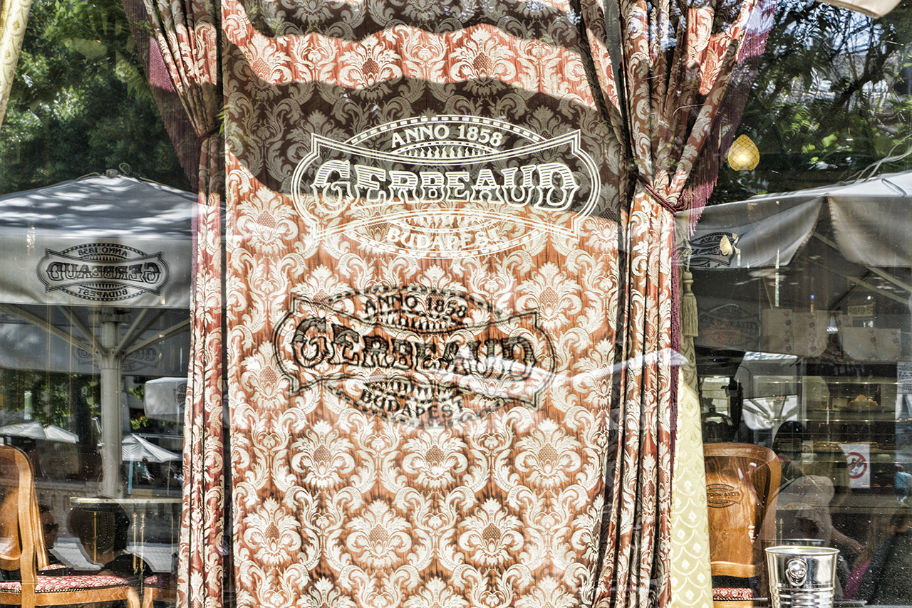 My 2 favorite things combined in one photo. A reflection of the outside cafe and the shadow of the sign embossed on the window.