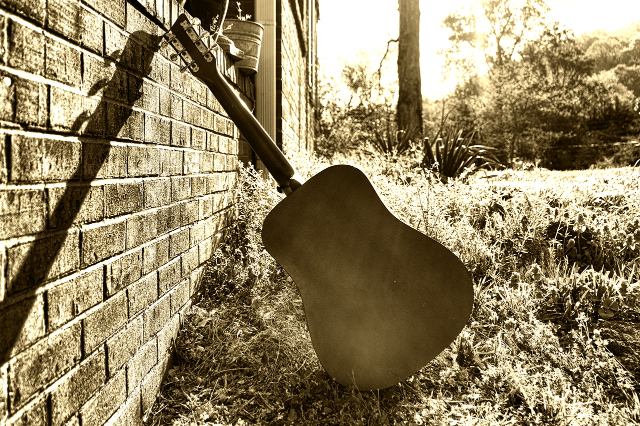An acoustic guitar waits for someone to come along and play it.