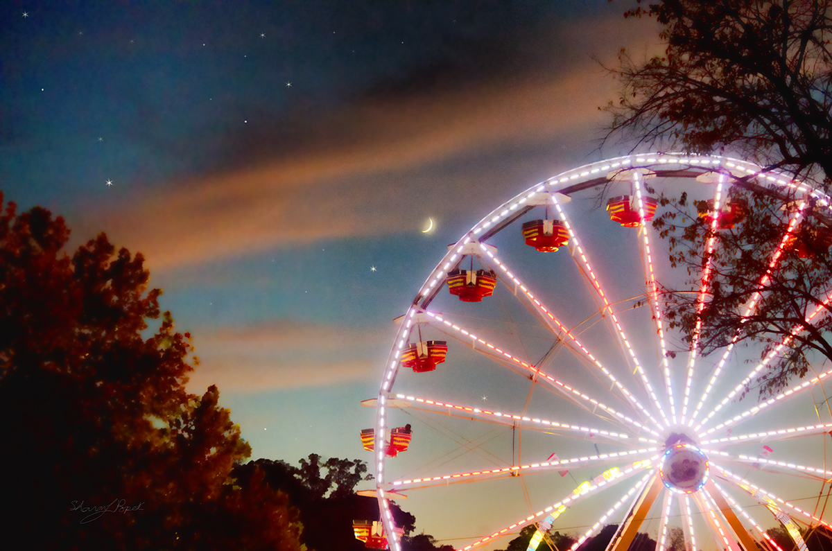 The circle of a ferris wheel at dusk.